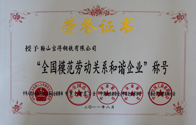2011年8月15日,在北京召开的全国构建和谐劳动关系先进表彰暨经验交流会上,公司被国家人力资源和社会保障部、中华全国总工会、中国企业联合会、中国企业家协会、中华全国工商业联合会表彰,并授予“全国模范劳动关系和谐企业”称号。鞍山市仅宝得公司一家企业获此殊荣。