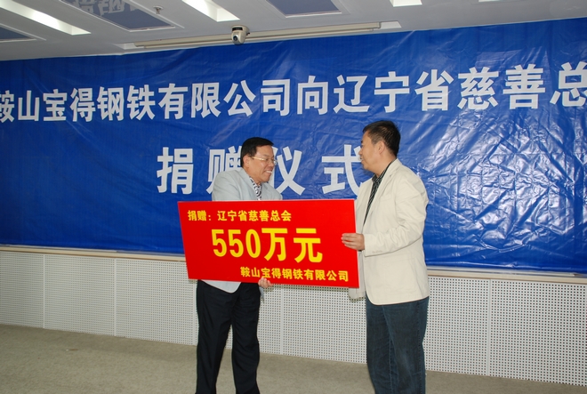 辽宁省慈善总会会长张行湘从公司总经理张铁汉手中接过550万元捐赠款