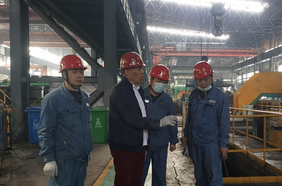 董事长(左二)在轧钢厂检修现场视察,公司副总经理路士洪(右二)、轧钢厂厂长马振广(右一)、轧钢厂成品车间副主任李树生(左一)等主要领导全程陪同