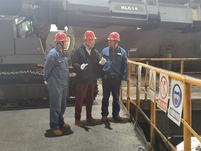 董事长(左二)在炼钢厂检修现场视察,公司副总调度长李成哲(左一)、炼钢厂厂长闫海龙(右一)等主要领导全程陪同